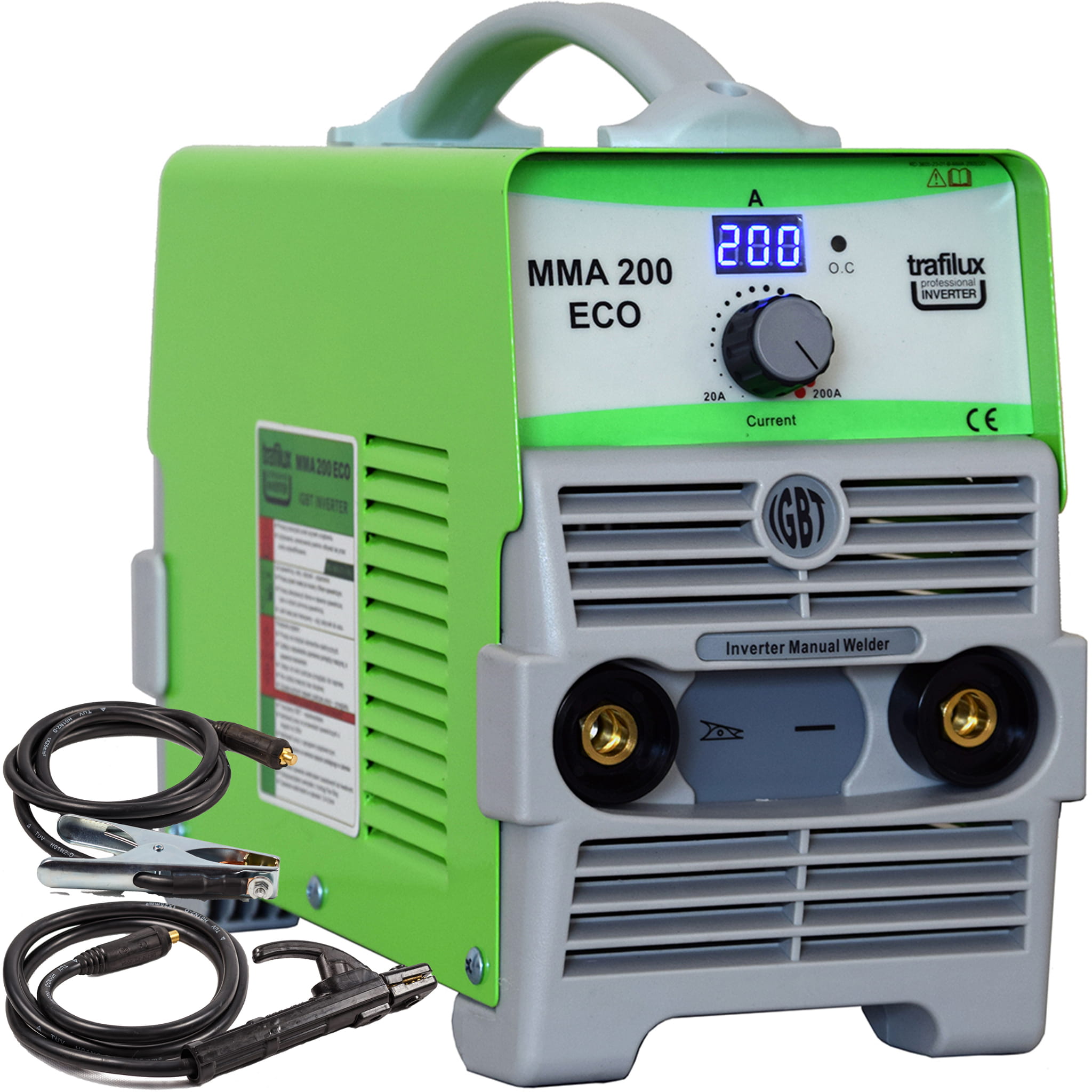 TRAFILUX MMA200 ECO to lekkie, przenośne inwertorowe urządzenie zapewniające możliwość spawania elektrodami otulonymi. TRAFILUX MMA 200ECO nadaje się do użytkowania warunkach gospodarstwa domowego oraz warsztatowych. Idealnie sprawdzi się podczas prac naprawczych, montażowych, oraz zadań w terenie. Zaletą urządzenia jest możliwość pracy z agregatami prądotwórczymi, co znacznie ułatwia prace terenowe. Urządzenie pozwala na spawanie elektrodami kwaśnymi oraz zasadowymi w zakresie 1.6-4,0 mm. Urządzenie służy do spawania stali, z uwzględnieniem stali nierdzewnej, żaroodpornej oraz żeliwa. Atutem konstrukcyjnym urządzenia są tranzystory wykonane w technologii IGBT. Cechą charakterystyczną dla tego typu tranzystorów jest, mniejsze zużycie energii, mniejsze zakłócenia elektromagnetyczne, przy większej wydajności oraz mocniejszym i stabilniejszym łuku spawalniczym