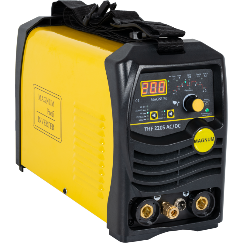 MAGNUM THF 220S AC/DC to lekka, inwertorowa spawarka przeznaczona do spawania metodą TIG HF prądem stałym (DC) oraz przemiennym (AC), a także metodą MMA.
