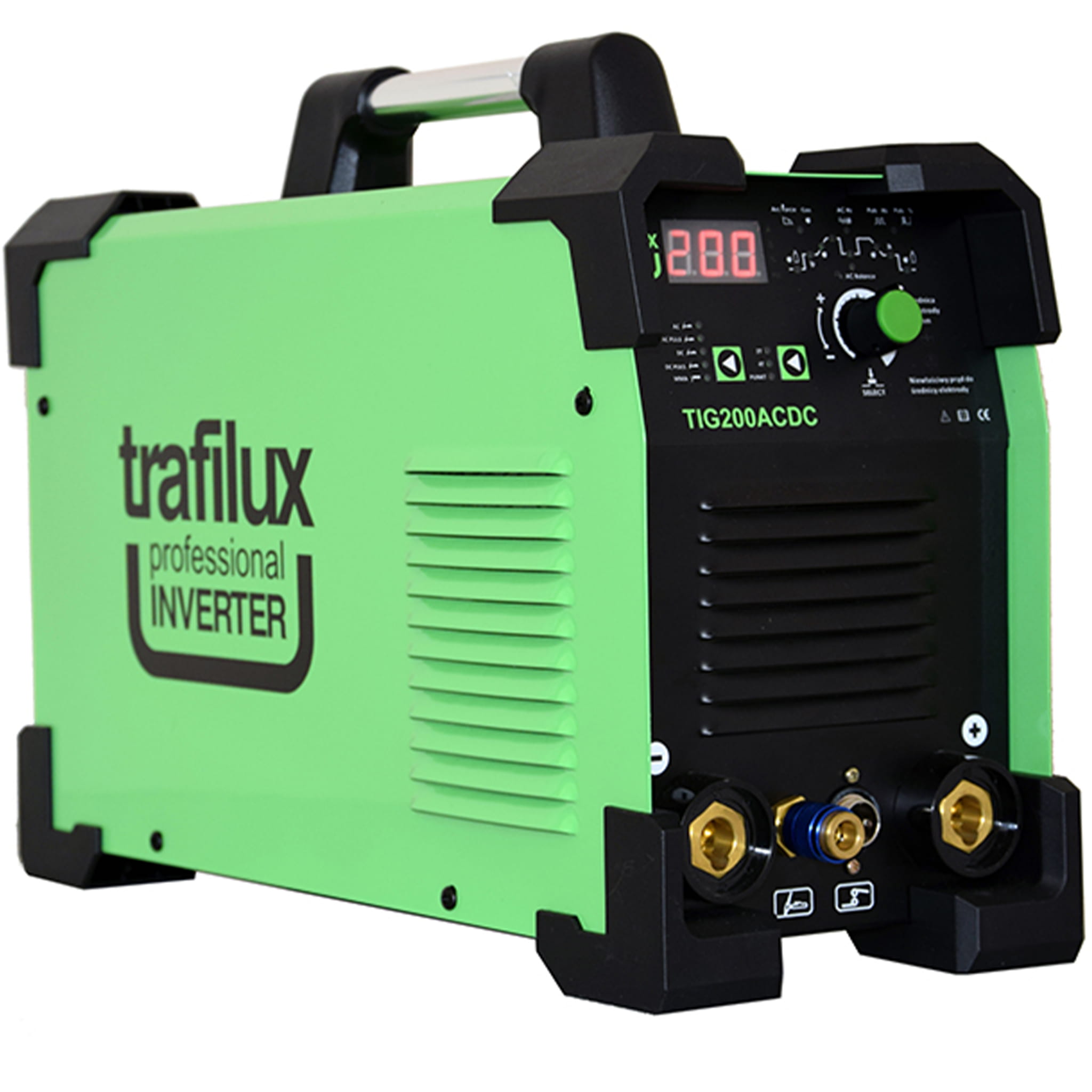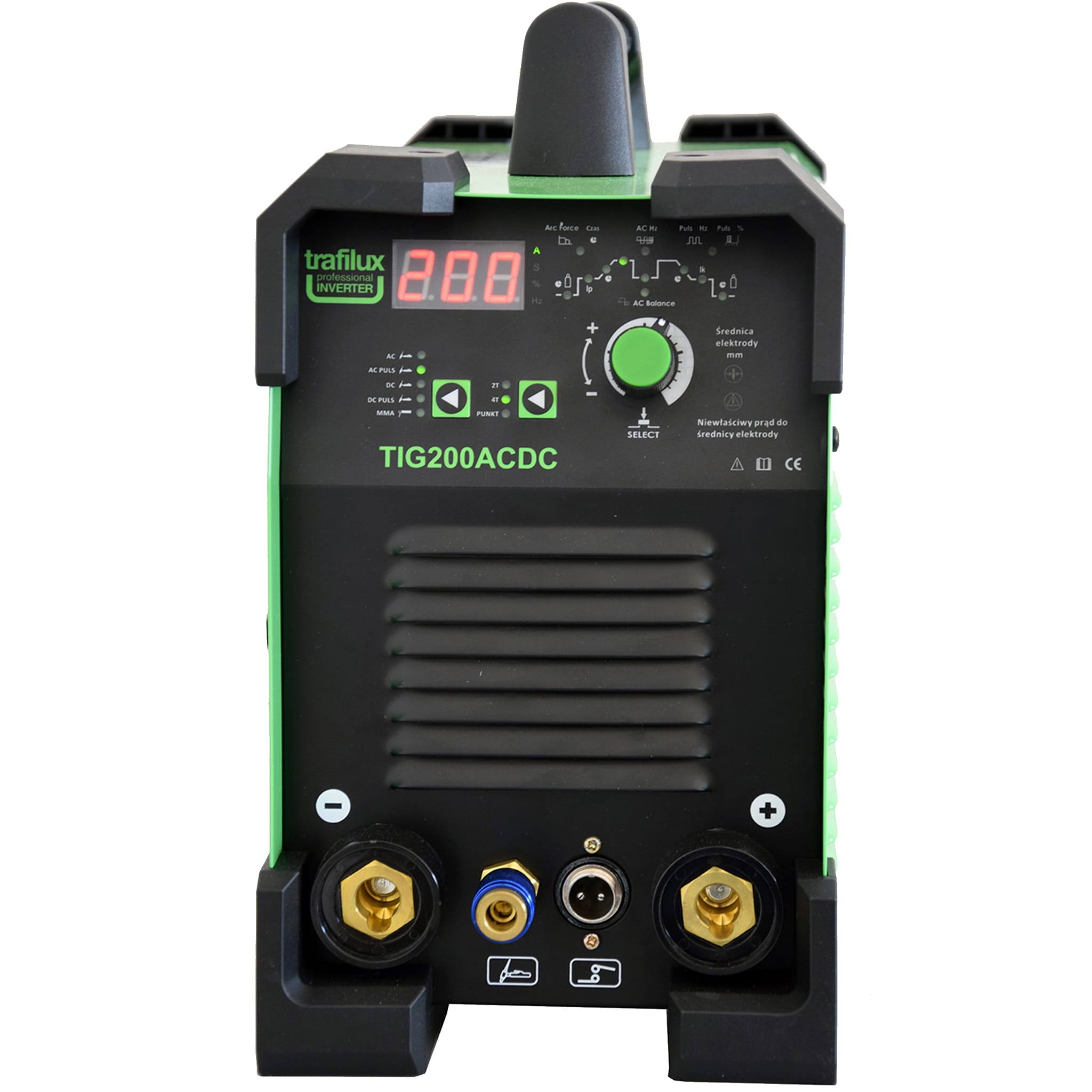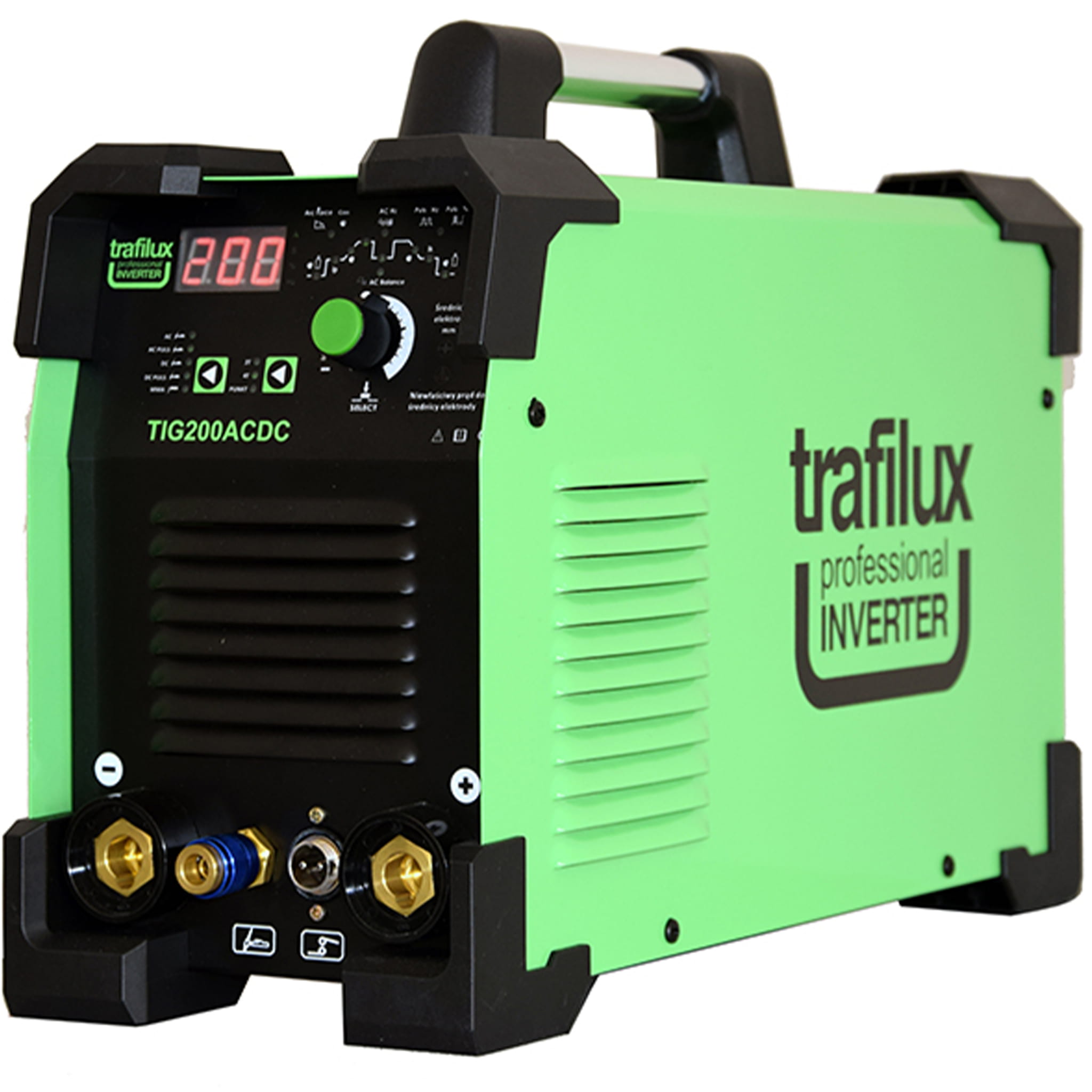 TIG 200 AC/DC TRAFILUX to przemysłowe urządzenie inwertorowe, oparte na technologii IGBT, przystosowane do spawania stali węglowych, nierdzewnych, kwasoodpornych, miedzi, mosiądzu, magnezu, tytanu, wszystkich stopów aluminium. Urządzenie przeznaczona do prowadzenia profesjonalnych prac spawalniczych. Dzięki zastosowanemu panelowi sterowania „Digital” ustawienie parametrów pracy jest łatwe I intuicyjne, nawet dla mniej zaawansowanych użytkowników. Atutem urządzenia jest wysoka jakość wykonania, która przekłada się na bezpośrednio na rezultat prowadzonych prac spawalniczych. Urządzenie posiada funkcję umożliwiający wprowadzenie średnicy elektrody TIG/MMA, dzięki której monitorowane są parametry pracy, w przypadku zbyt niskiego lub wysokiego parametru prądowego dla danej średnicy elektrody, urządzenie aktywuję komunikat o błędnych parametrach pracy.Urządzenie TRAFILUX TIG 200ACDC posiada funkcje pulsu co idealnie wpływa na spoinę oraz sprawdza się przy spawaniu cienkich blach.