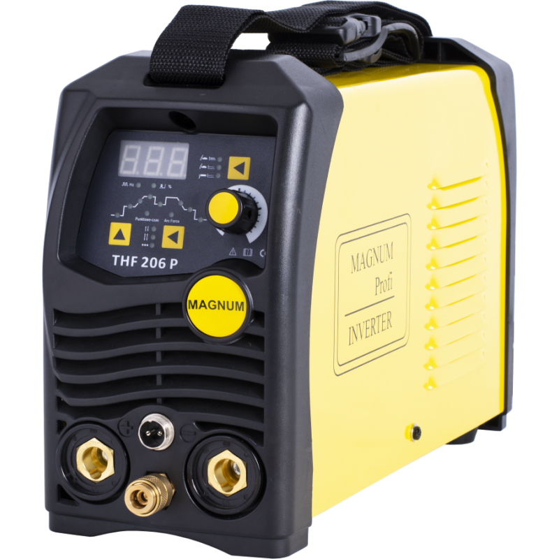 MAGNUM THF 206P to lekka, przenośna spawarka inwertorowa przeznaczona do spawania metodą TIG HF (bezdotykowe zajarzanie łuku) prądem stałym DC oraz metodą MMA.