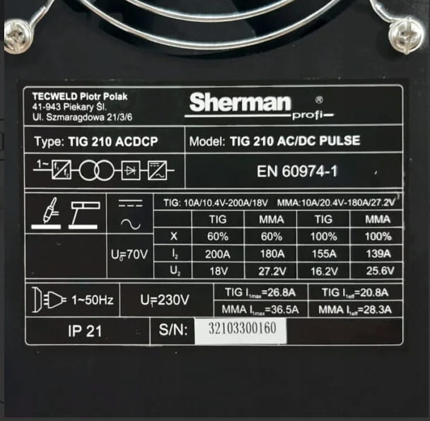 Spawarka inwertorowa Sherman TIG 210 AC/DC PULS ZESTAW 2